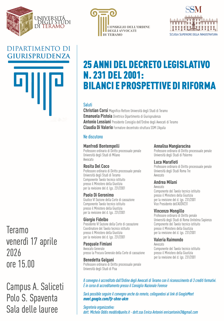 Segnaliamo ai lettori che il prossimo venerdì 17 aprile, dalle ore 15.00, presso l'Università di Teramo, si terrà il convegno "25 anni del Decreto legislativo n. 231 del 2011: bilanci e prospettive di riforma"
