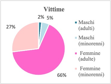 Quanto alle 142 persone offese di sesso femminile, 101 erano maggiorenni al momento del fatto e 41 ancora minorenni: una proporzione invertita rispetto a quella presente tra le (poche) vittime di sesso maschile e che consente di confermare la natura tendenzialmente unidirezionale del delitto di violenza sessuale, pressoché sempre agito da uomini nei confronti di donne.