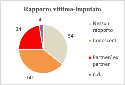 Solo in un terzo dei casi (54 casi su 152) l’imputato era un estraneo per la persona offesa (anche se in alcuni casi avevano avuto sporadici ed isolati contatti); nei restanti casi vi era tra l’imputato e la vittima un preesistente rapporto di conoscenza, familiare, amicale, lavorativo etc. (60 casi) o sentimentale (34 casi), trattandosi di partner o ex-partner. Nei 4 casi restanti non è stato possibile ricostruire la natura del rapporto.