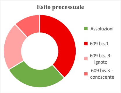 Le sentenze di assoluzione, in tutto 43, sono intervenute per lo più in seguito a dibattimento (36 casi); solo in 7 casi sono state pronunciate in udienza preliminare, avendo l’imputato chiesto giudizio abbreviato. Si tratta per lo più di assoluzioni nel merito (36 su 43), in quanto si è ritenuto che “il fatto non sussiste” (33 casi su 36).